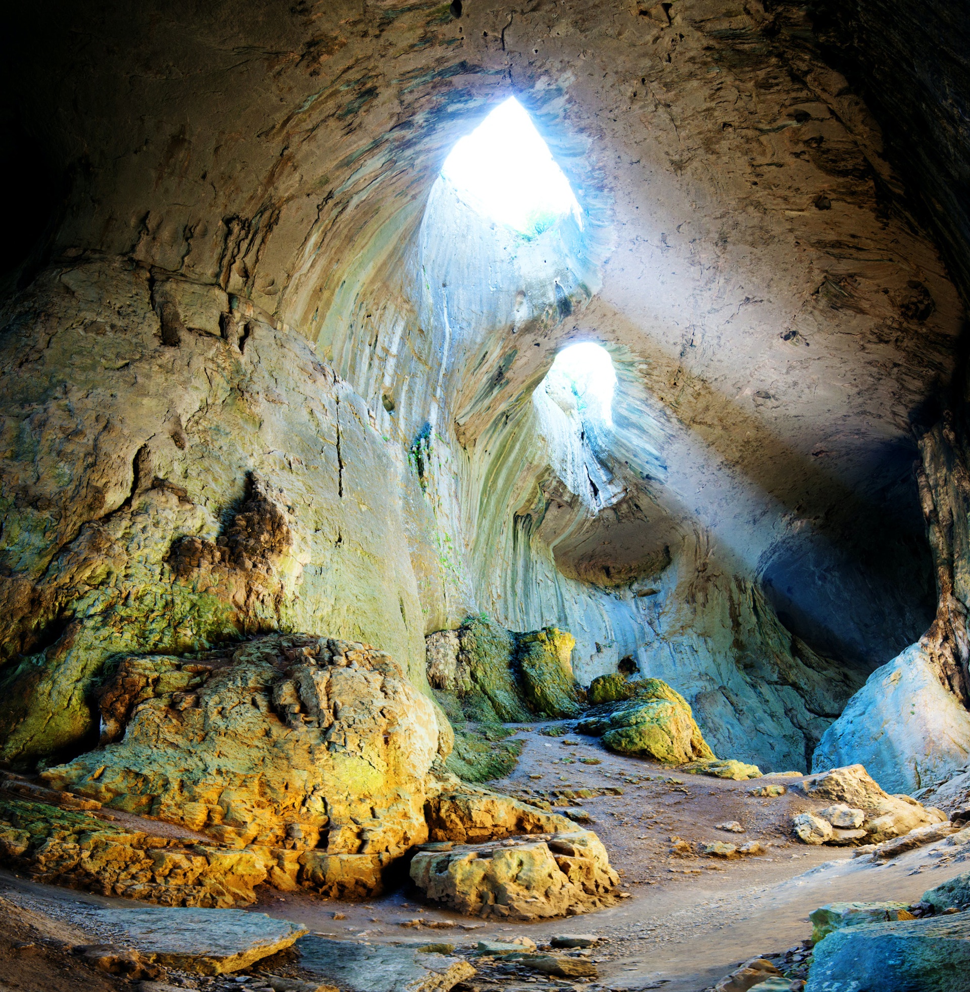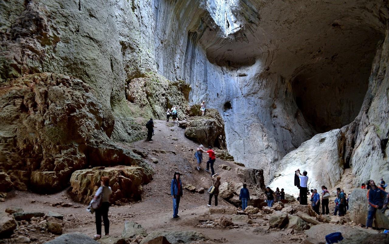 Ánh sáng rọi qua 2 lỗ hổng lớn, chiếu thẳng vào hang động Prohodna tạo nên một khung cảnh huyền bí, thu hút du khách đến khám phá.