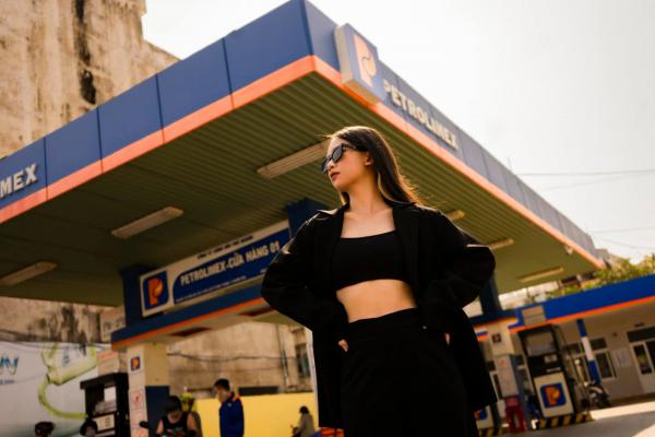 Nữ sinh Nha Trang “thả dáng” bên cây xăng. Bộ ảnh được thực hiện nhanh chóng trong thời gian rất ngắn để tránh làm ảnh hưởng tới hoạt động kinh doanh tại cây xăng - Ảnh: Minh Trần“Mình thấy giá xăng tăng cao, cây xăng trở thành địa điểm được nhiều người quan tâm, chú ý. Đúng lúc đó, bạn Minh có lời mời chụp hình tại cây xăng nên mình đồng ý ngay vì thấy ý tưởng rất hấp dẫn”, 10X chia sẻ.