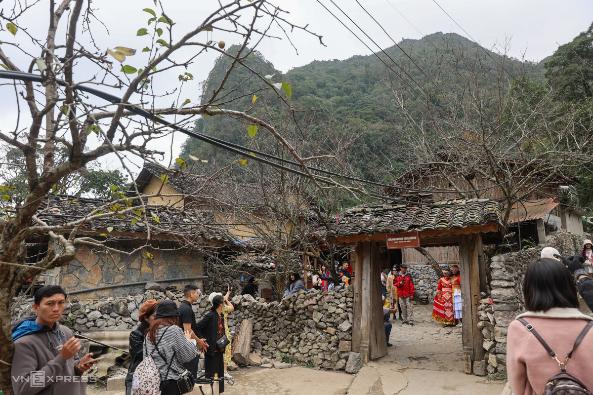 Cổng chính nhà dựng bằng gỗ, lớp mái ngói là điểm thu hút nhiều khách tham quan. Theo các hướng dẫn viên, người Mông không sử dụng bản lề, then chốt cửa làm bằng sắt mà hoàn toàn bằng gỗ. Họ quan niệm cửa như lòng người, nếu làm bằng sắt thép là những vật cứng được ví như dao kiếm, không thể hiện lòng tốt, sự hiếu khách của chủ nhà. Tại lối vào, du khách có thể thuê trang phục để chụp hình với giá 30.000 đồng một bộ.