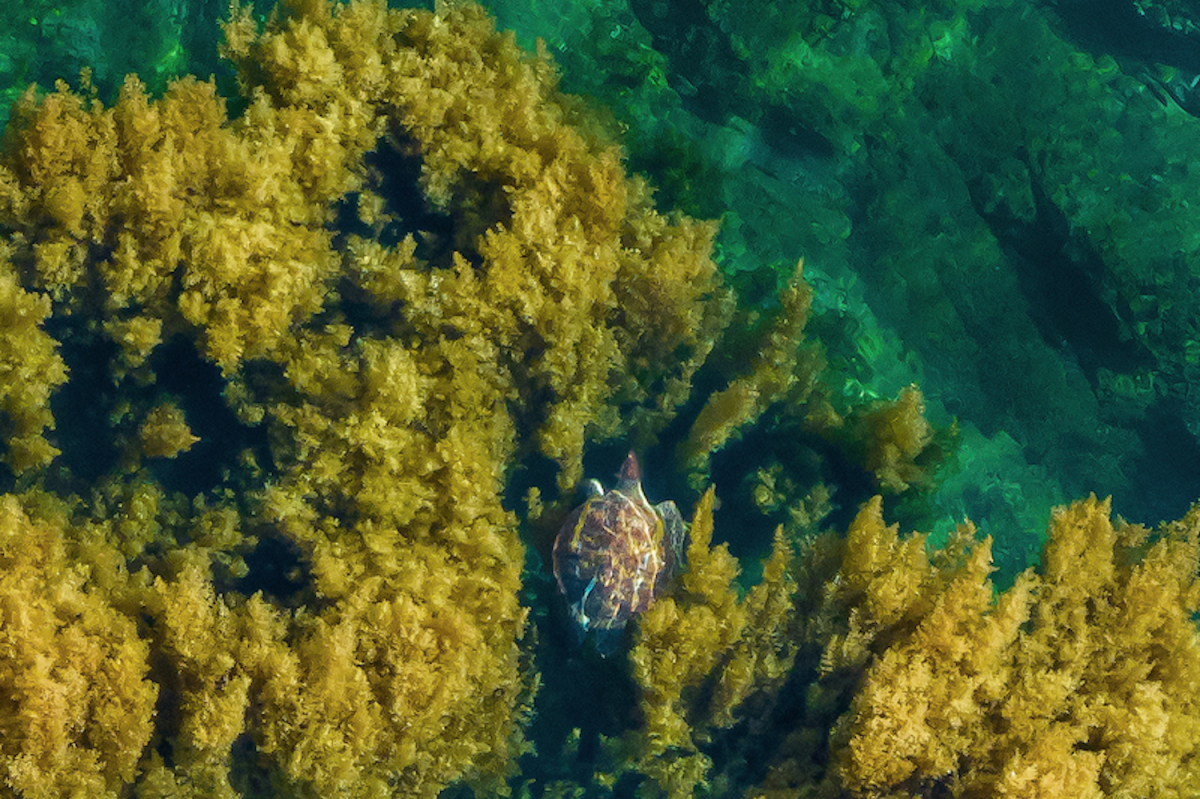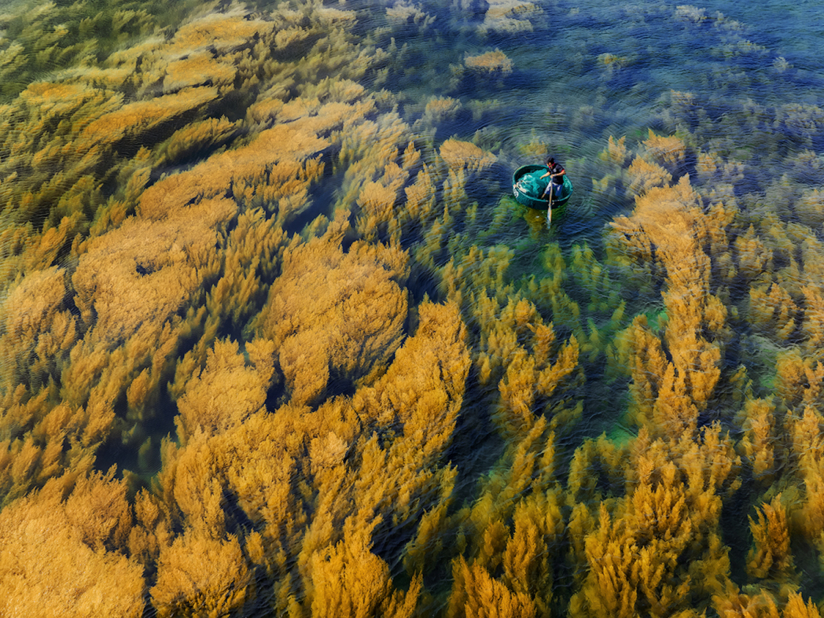 Mùa nước cạn từ tháng 5 đến 7, vùng biển Nhơn Hải rực sắc màu rong mơ, khiến người ta liên tưởng tới rừng lá vàng dưới nước.