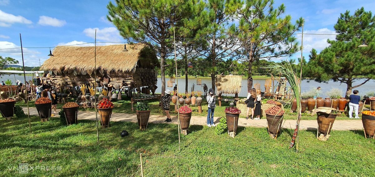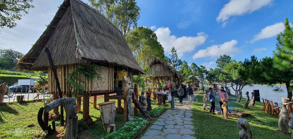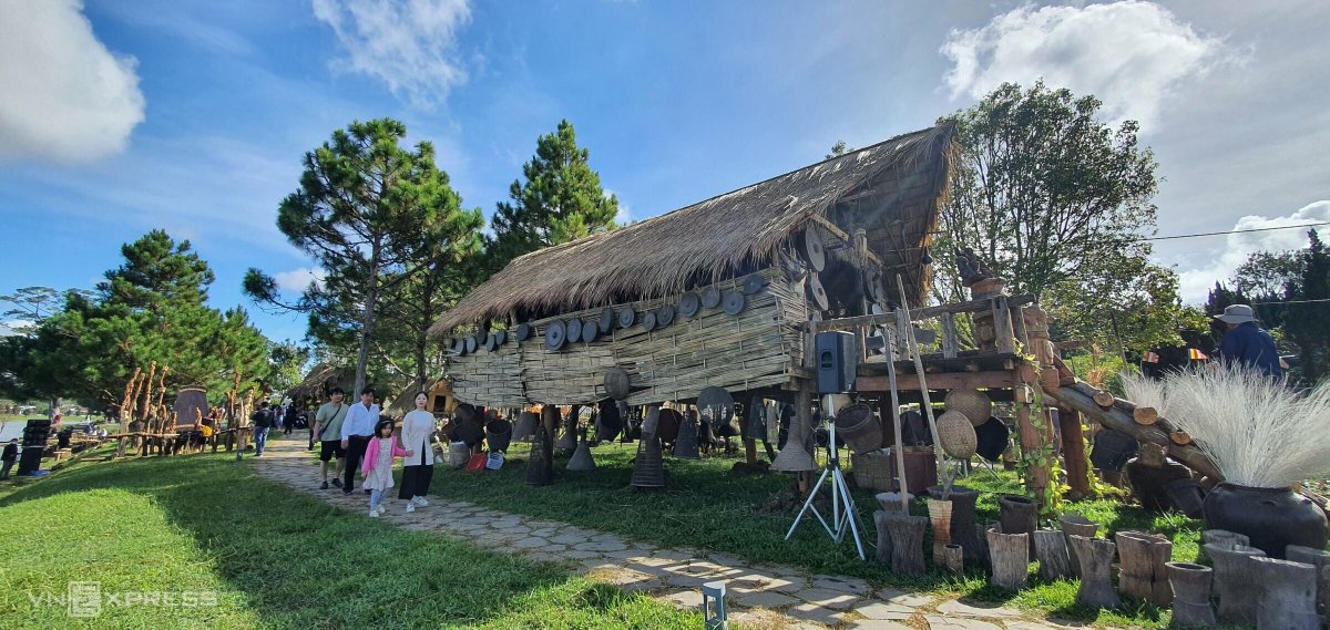Một không gian Tây Nguyên với nhà dài, nhà rông, cồng chiêng, nhà mồ, sản vật... được tái hiện bên hồ Xuân Hương, TP Đà Lạt.