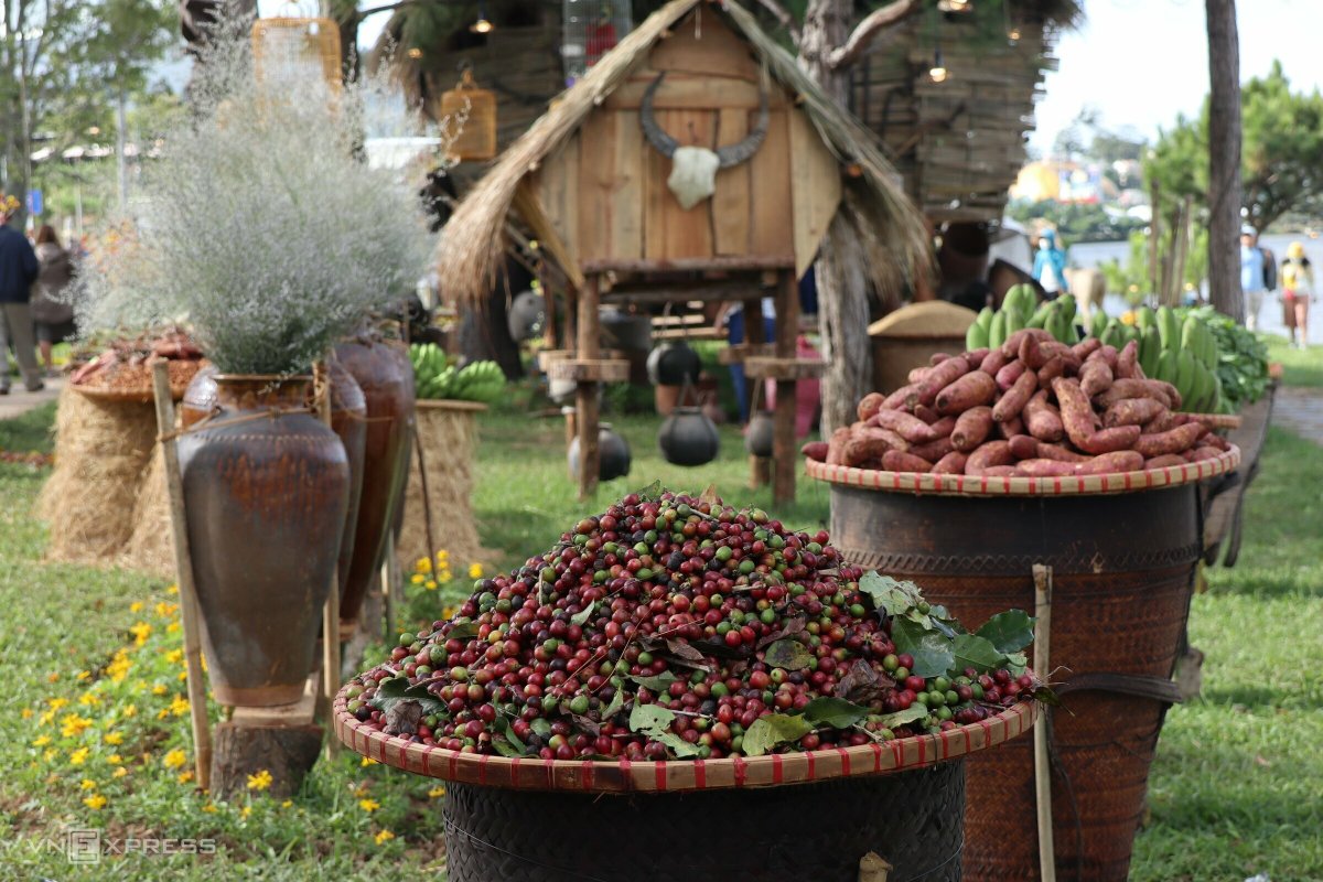 Một số sản vật đặc trưng núi rừng Tây Nguyên cũng được trưng bày để du khách tham quan như cà phê, khoai lang, bơ...