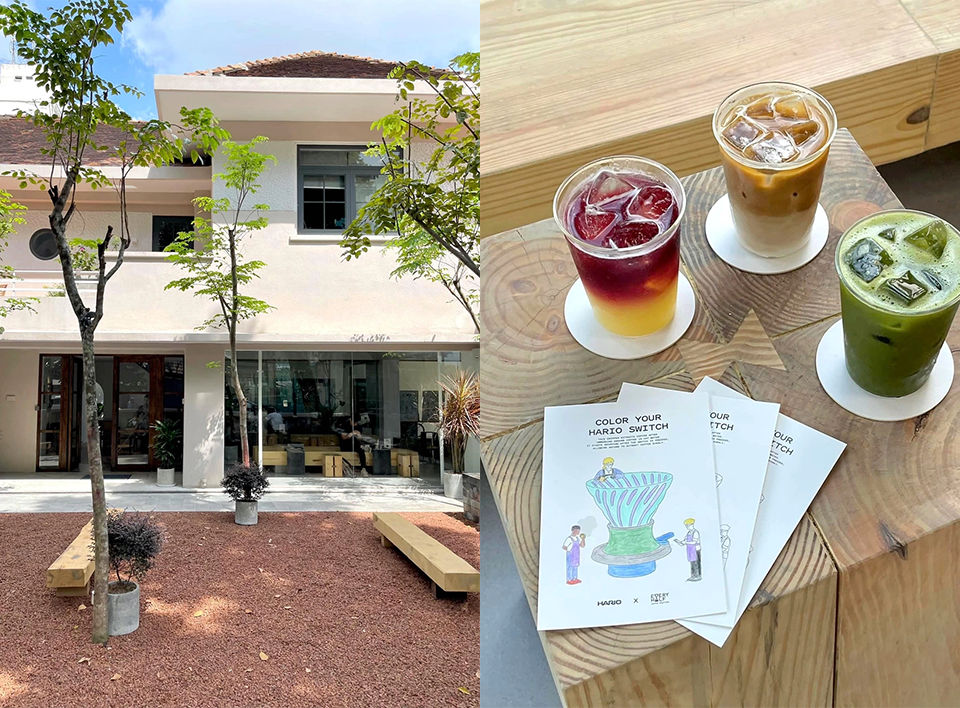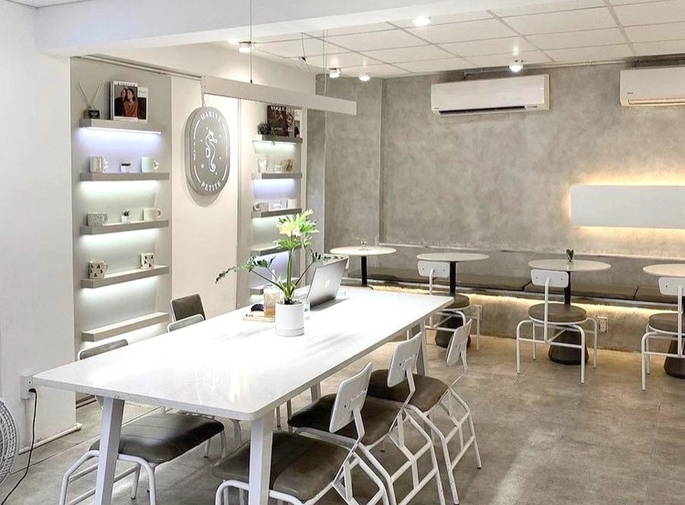 Các quán cà phê nổi bật bức tường gam màu trắng xám, đan xen cây xanh, đem đến không gian tối giản và giàu cảm hứng tích cực.