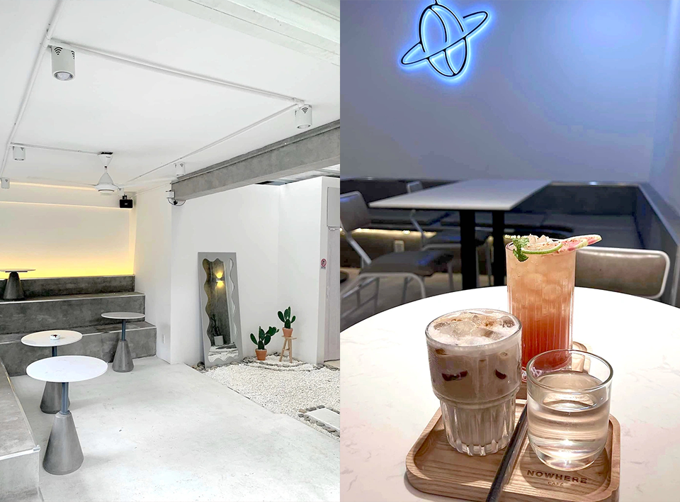 Ảnh: Nowhere Café, Út Tiên. Hoạt động từ tháng 4, quán vẫn thu hút giới trẻ check-in nhờ không gian nổi bật phong cách tối giản và gam màu xám trắng chủ đạo.