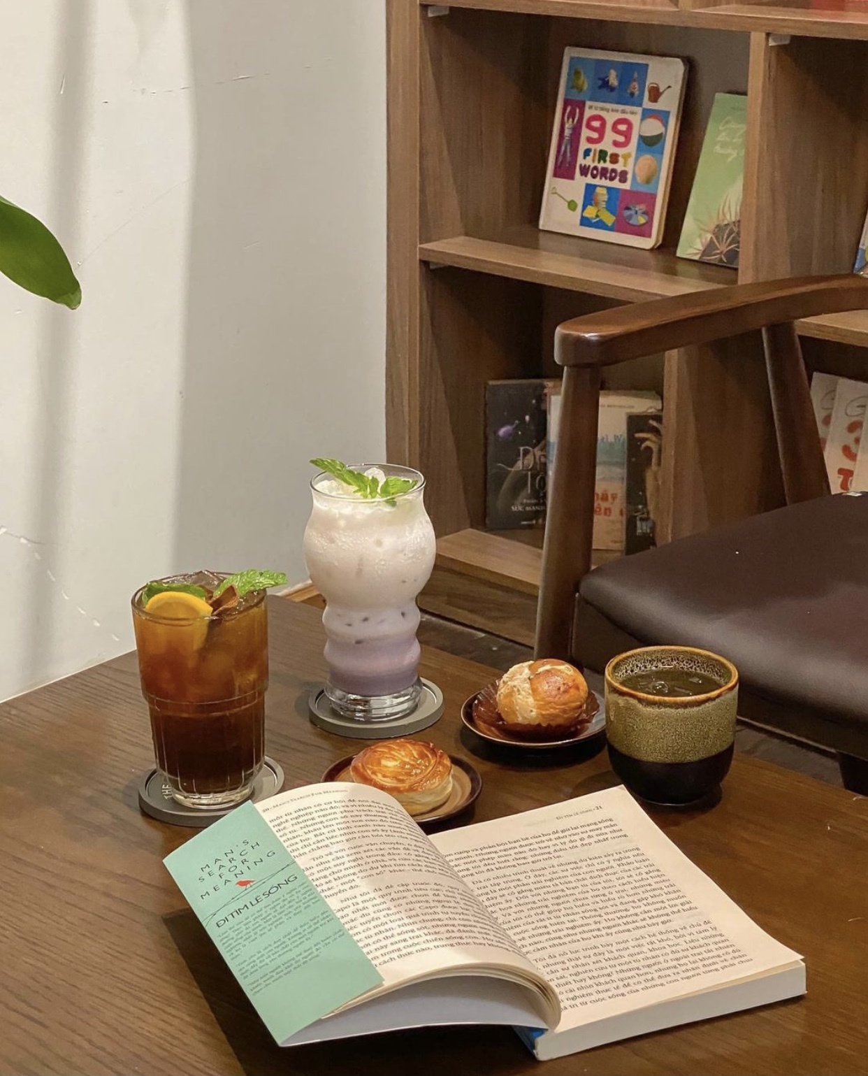 - Tiệm bố trí bàn thấp để ngồi ghế đọc sách và bàn cao để làm việc. Nơi đây cũng thiết kế nhiều góc riêng tư, lý tưởng cho các nhóm nhỏ trao đổi công việc. Quán bật nhạc không lời, phù hợp cho những hoạt động cá nhân cần sự tập trung.