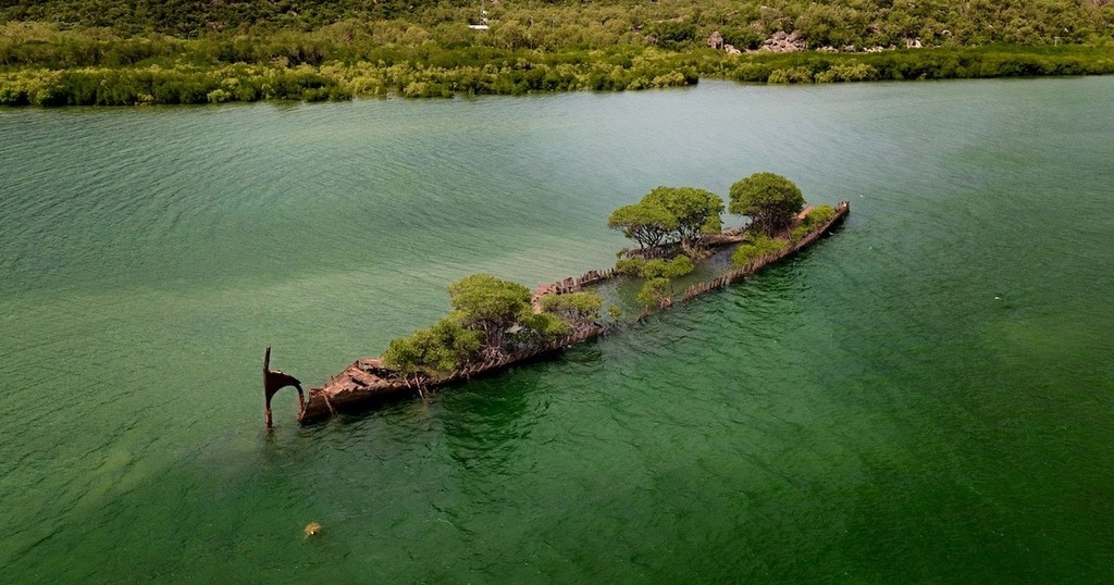 4. Tàu đắm ở Adelaide (Australia): SS City of Adelaide là một con tàu vỏ sắt được hạ thủy ở Scotland năm 1863. Trải qua một thời gian dài phục vụ hành khách và hàng hóa tại Australia, con tàu bị chìm ngoài khơi Queensland vào năm 1916. Ngày nay, con tàu vẫn đắm mình trong làn nước của vùng biển vịnh Cockle, thành một điểm tham quan hút khách. Nhìn từ đất liền, con tàu tựa một hòn đảo tí hon bởi cây cối mọc kín khoang.