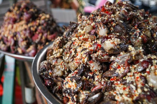 Ảnh: wheretoeat.inphanthiet Ở các tỉnh Ninh Thuận, Bình Thuận có món bánh tráng mắm ruốc nổi tiếng. Mắm ruốc cũng được làm gia vị chấm cho bánh tráng nướng và các loại trái cây như cóc, xoài, ổi... Mắm được làm từ con ruốc nhưng có màu sắc và mùi vị hoàn toàn khác mắm tôm miền Bắc. Mắm có màu nâu đỏ, thơm nhẹ không quá mặn, người ta thường trộn thêm ớt, đường, me để hỗn hợp có vị chua, cay, mặn, ngọt hài hòa, hấp dẫn. Ở Huế, mắm ruốc là nguyên liệu phổ biến trong các món ăn địa phương như bún bò, cơm hến, mắm ruốc kho thịt...