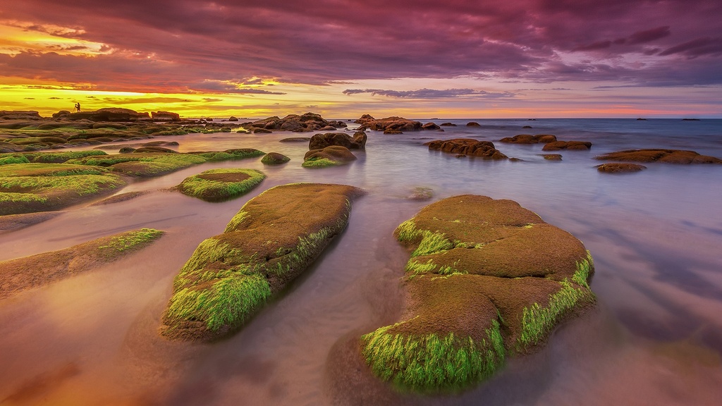 Bãi biển Cổ Thạch, Việt Nam quyến rũ bởi làn nước biển trong xanh, cùng những bãi đá nhiều màu sắc. Đặc biệt, khoảng tháng 1-2 hàng năm, bãi biển Cổ Thạch khoác lên mình chiếc áo rêu phong, đẹp tuyệt mỹ. Du khách đến đây có thể tham quan các địa điểm nổi tiếng như Lăng Cá Ông, Núi đỏ Gành Son, Chùa Hang... Ảnh: Windows 10 Spotlight Images.