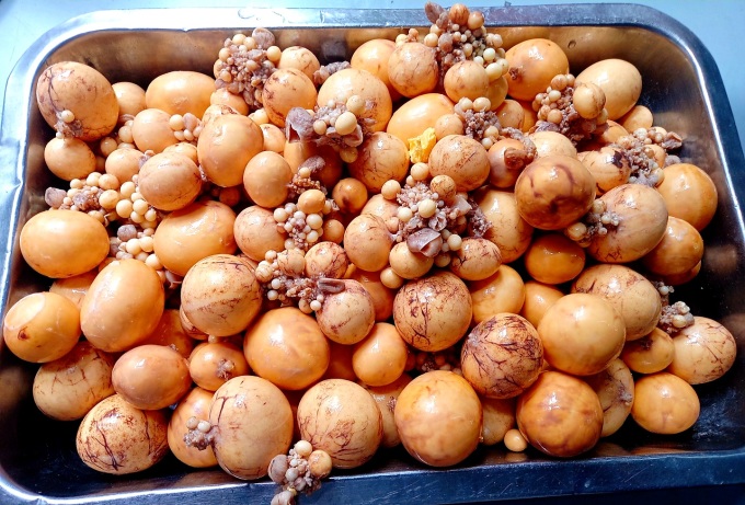 Trứng gà non luộc với nhiệt độ và canh chỉnh giờ để có lòng đào nhưng không bị tanh. Ảnh: Khánh Thiện Món bánh ướt lòng gà không thể thiếu nước chấm. Theo anh Giàu, vì là người gốc miền Tây, vốn quen với ăn gì cũng phải ngọt, nên anh đã không ít lần gặp thất bại khi bắt tay làm nước chấm. "Nhiều lần được thực khách góp ý, chỉ một thời gian sau khi mở quán, tôi đã gia giảm thành công món nước chấm với đủ vị mặn, ngọt, chua, cay, phù hợp khẩu vị người Sài Gòn", chủ quán cho hay.