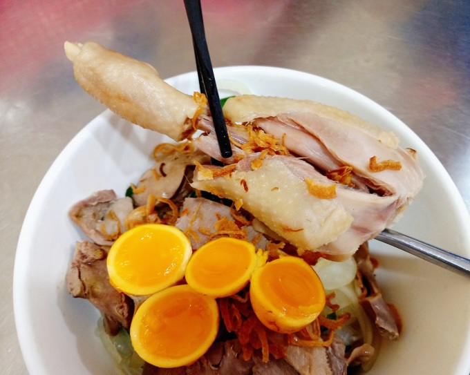 Thịt gà dai, không khô cùng trứng non luộc lòng đào hòa quyện cùng các nguyên liệu khác. Ảnh: Khánh Thiện Quán mở cửa từ 8h đến 21h mỗi ngày, đông nhất trong khoảng thời gian 11h-13h và 18h-20h. Trung bình mỗi ngày quán bán được khoảng 40 con gà, 80 kg bánh ướt... Một hạn chế của quán là không gian nhỏ nên khó có thể ngồi ăn tại chỗ, nhất là vào giờ cao điểm. Ở đây cũng không có chỗ để xe rộng, nên lý tưởng nhất là khách mua mang đi hoặc gọi đặt hàng cho các ứng dụng.