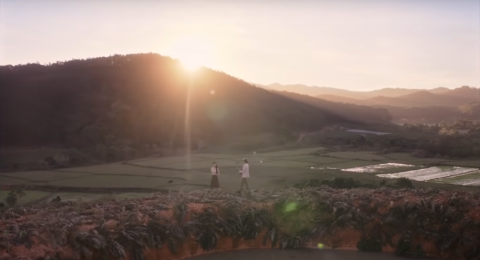 Bảo Lộc xuất hiện trên phim "Em và Trịnh". Ảnh: Nhà sản xuất Cao nguyên B'lao xưa giờ là thành phố Bảo Lộc, trung tâm hành chính thứ hai của tỉnh Lâm Đồng, cách Đà Lạt khoảng 100 km. Bên cạnh một Đà Lạt đã quá thu hút khách du lịch, Bảo Lộc như một vẻ đẹp tiềm ẩn với khí hậu se lạnh, địa hình vùng cao như một nước ôn đới. Hiện tại, tên B'lao vẫn được giữ lại cho một phường của thành phố. Theo người Mạ, B'lao có nghĩa là đám mây bay thấp còn đối với người K'Ho, B'lao có nghĩa là những điều tốt đẹp.