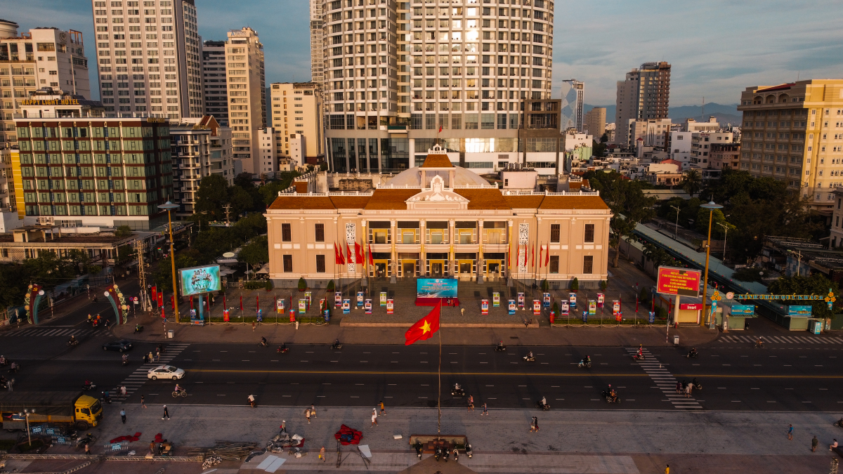 Trung tâm Hội nghị 46 Trần Phú, nơi thường diễn ra nhiều sự kiện lớn của tỉnh Khánh Hòa. Khi bình minh lên, khoảng sân phía trước tập trung đông người đi bộ, tập thể dục. "Vào mùa cao điểm du lịch hè, đoạn này thường xuyên xảy ra tình trạng ùn tắc", anh Chính nói.