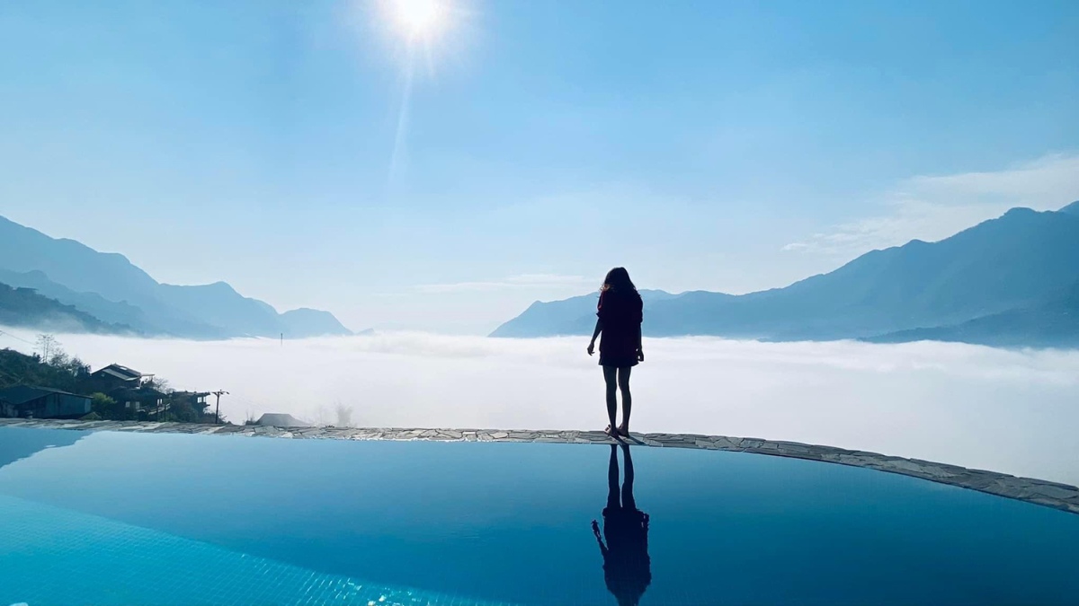 Tại bể bơi ngoài trời, du khách có thể vừa ngâm mình trong nước, vừa chứng kiến biển mây như siêu thực. Bể bơi vô cực có cả nước ấm.