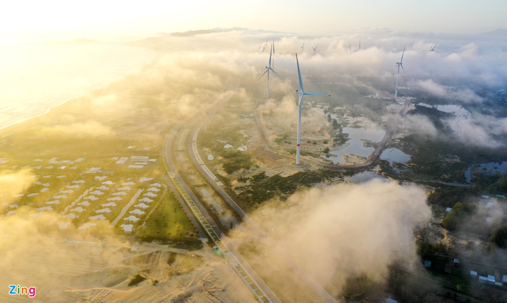 Vào buổi bình minh có thể chiêm ngưỡng "thung lũng mây" huyền ảo trôi bồng bềnh trên cánh đồng quạt gió ở xã Cát Tiến, huyện Phù Cát.