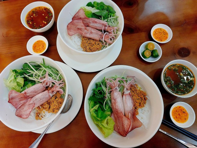 Tô bún có thịt rạm, mực câu tươi, dùng kèm chén nước lèo chấm cùng muối ớt chanh. Quán mở cửa lúc 7h đến 20h mỗi ngày. Một tô bún có giá 120.000 đồng. Ngoài ra, quán còn có thêm mì mực nháy, giá 100.000 đồng.