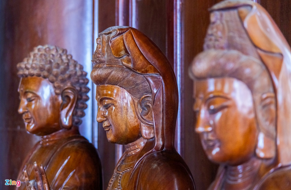 Nhiều tượng Phật Bồ Tát hóa thân đặt trong chánh điện. Chùa có tổng số 32 tượng Phật được chế tác hoàn toàn từ gỗ quý.