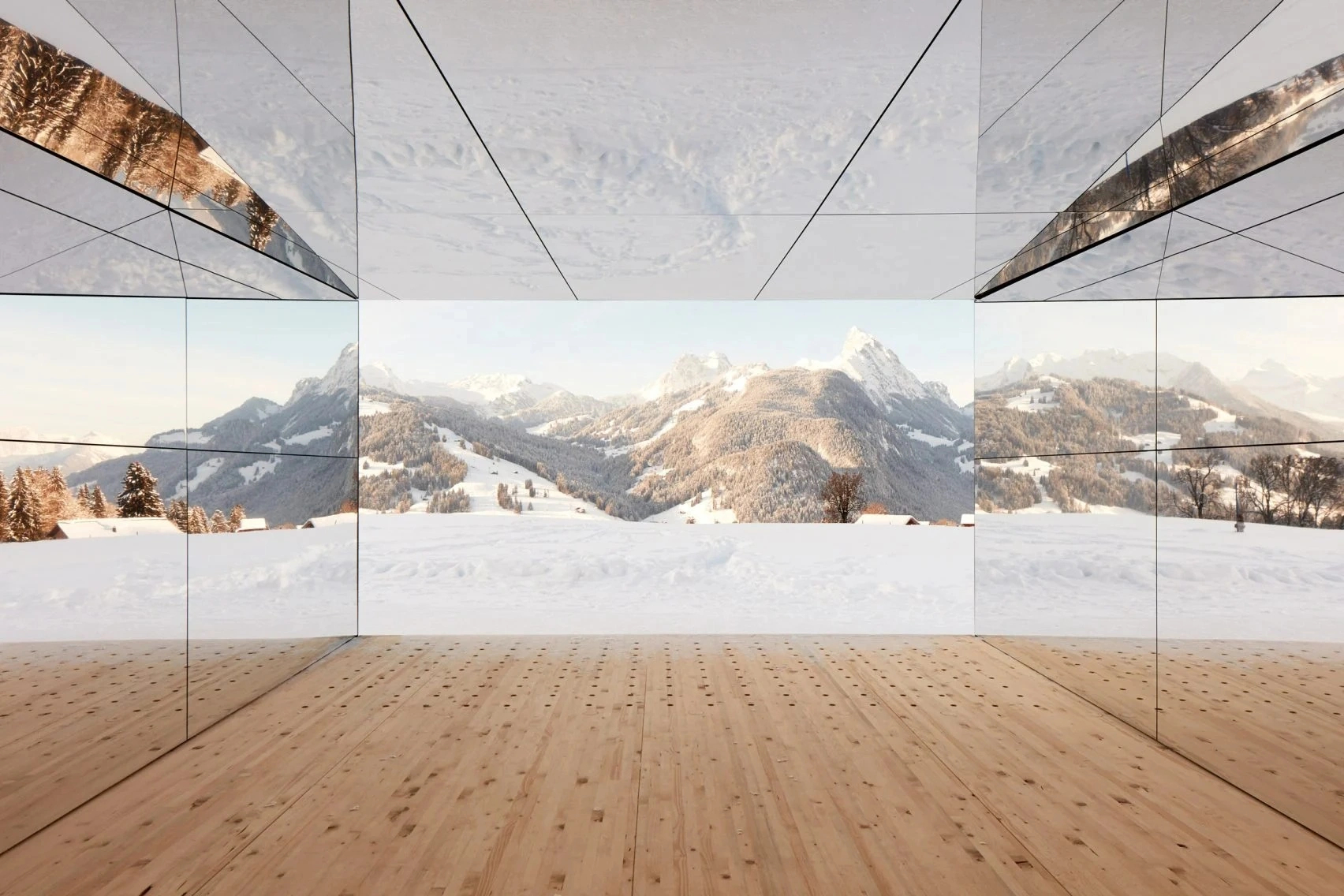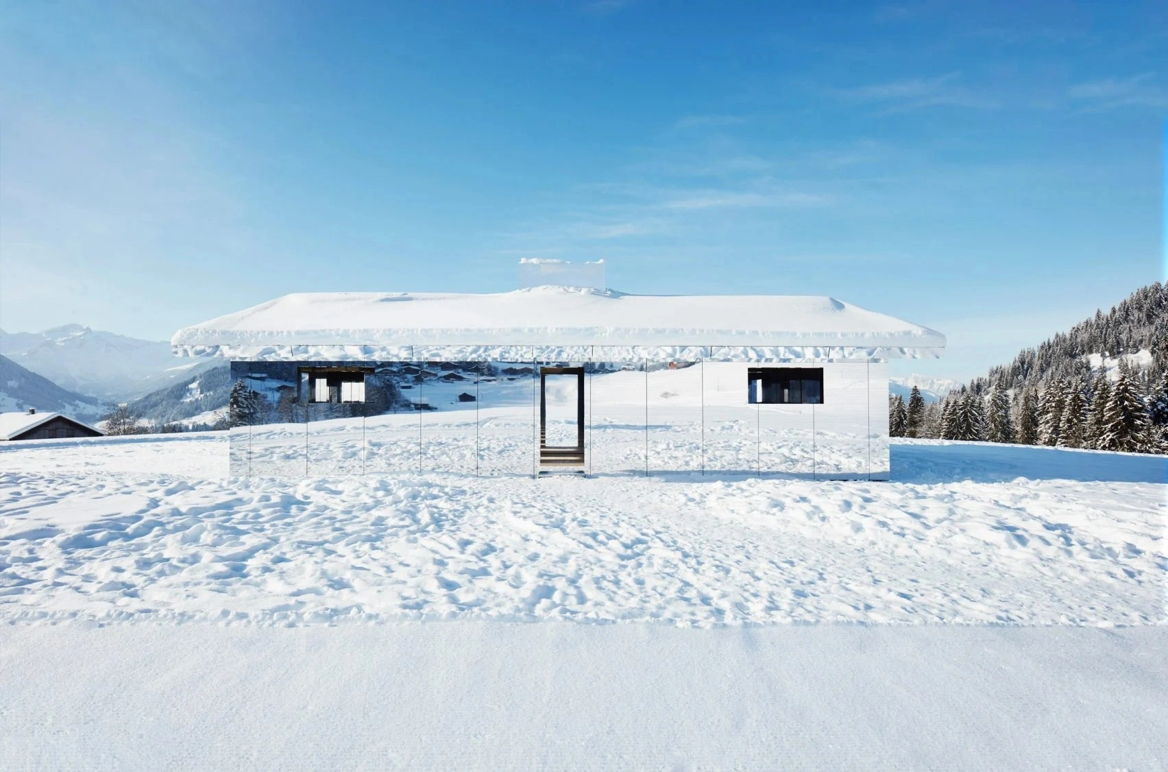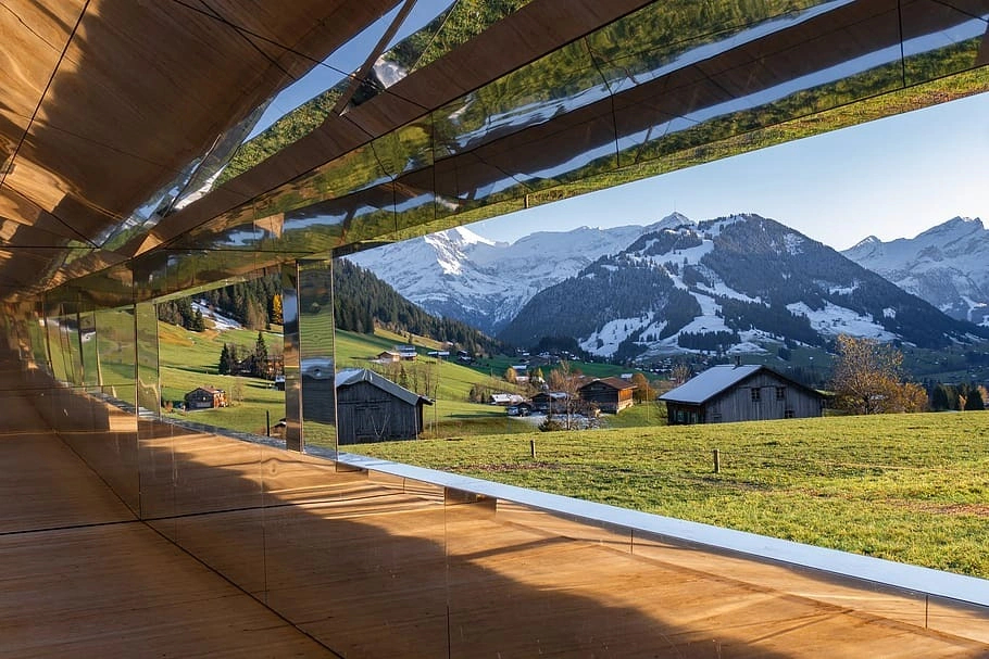 Từ một số góc độ, Mirage Gstaad dường như là một phần của thiên nhiên. Khi chìm đắm vào nó, du khách khó có thể phân biệt được đâu là cảnh thật, đâu là hình ảnh phản chiếu trong gương. Ảnh: Luma Foundation.