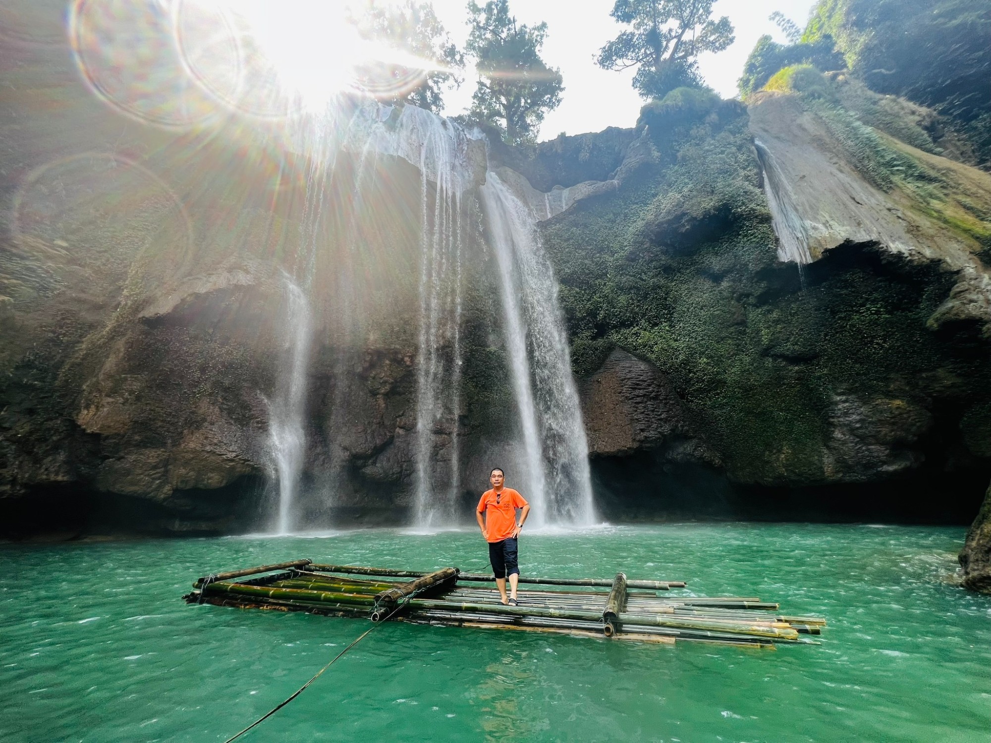 Chiếc bè kéo dây được chuẩn bị sẵn ở tầng thác thứ 2. Với 10.000 đồng/người, bạn có thể tự đẩy bè ra vùng gần thác nước và tạo 1 album "sống ảo" tuyệt đẹp