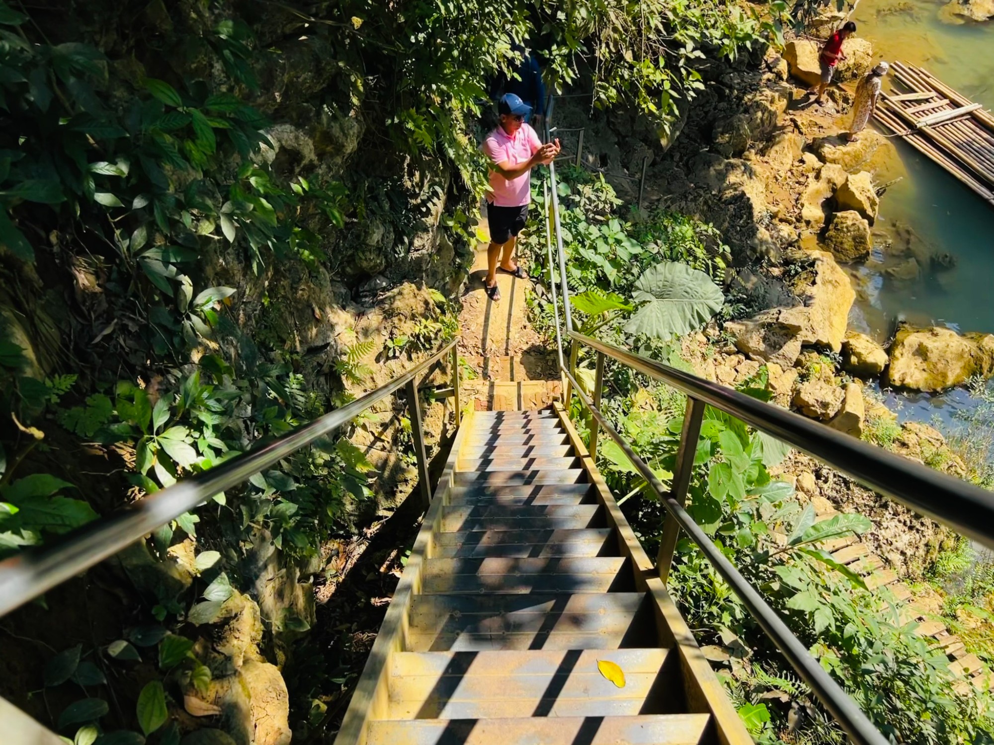Đường lên 3 tầng thác đi theo lối mòn, leo cầu thang xuyên qua tán cây rừng được gia cố bằng cầu thang sắt có tay vịn chắc chắn