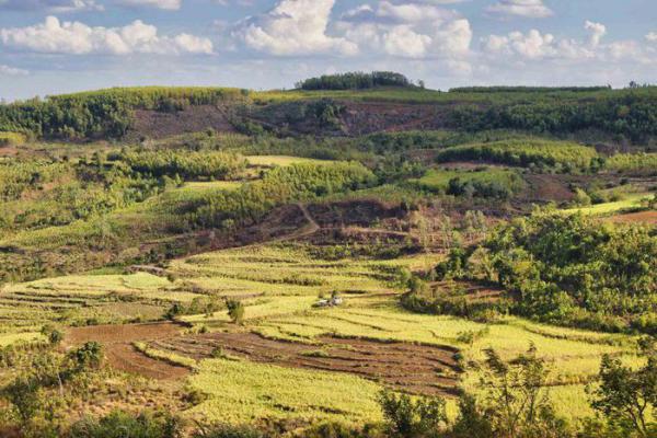 Con đường bê tông phẳng lỳ rộng rãiHai bên đường là bạt ngàn màu xanh của ruộng vườn, rừng cây, xen lẫn màu đỏ nâu đặc trưng của đất bazan. Những khoảng ruộng thường trải dài theo triền đồi hoặc nằm lọt trong các thung lũng nhỏ, xung quanh là trập trùng núi xanh.