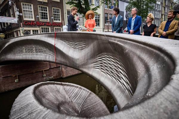 Cầu đi bộ bằng thép in 3D đầu tiên trên thế giới đã được ra mắt tại Amsterdam. Cây cầu MX3D được trang bị các cảm biến tiên tiến giúp đo lường và phân tích hành vi của người đi bộ trong thời gian thực. Theo Micha Mos, ủy viên hội đồng thành phố Amsterdam, điều này sẽ giúp họ hiểu được hành vi của mọi người ở nơi công cộng, lý giải cho sự xuống cấp của nhiều công trình cầu và kênh đào. Ảnh: Time Out.
