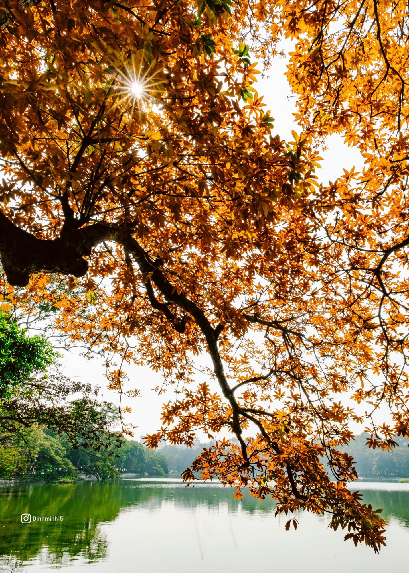 Cây mõ thay màu lá tạo nên khung cảnh rực rỡ nhưng không kém phần thơ mộng - Ảnh: Giang TrịnhChia sẻ cảm nhận của mình về cây mõ Hồ Gươm, nhiếp ảnh gia Trịnh Xuân Giang tâm sự: “Mình bắt đầu chụp cây mõ ngay từ những ngày đầu gắn bó với chiếc máy ảnh, tức là khoảng 15 năm trước. Vào mùa xuân cây mõ ra hoa, mùa đông lá sẽ chuyển sang màu vàng. Đây cũng là 2 thời điểm đẹp nhất của cây.
