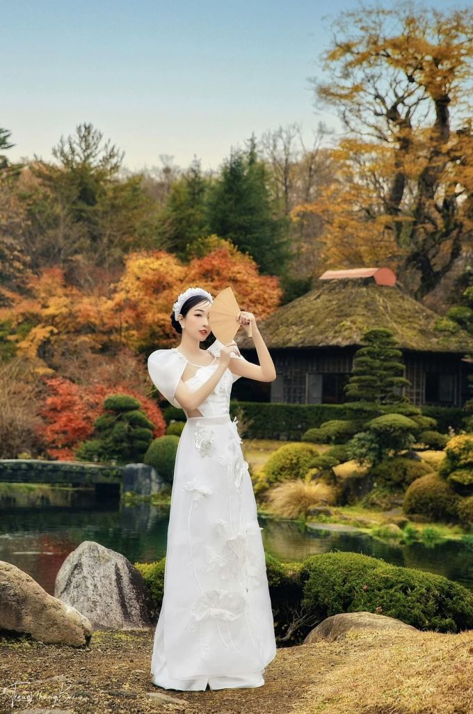 Một trong những bộ ảnh Nhung thích nhất là chụp với áo dài Việt Nam ở rừng trúc Arashiyama, làng Sagano, Kyoto. Thời điểm chụp ảnh, rừng trúc đã rất đông khách đến tham quan. "Mọi người xếp hàng để tham quan, chỉ có mình tôi là chụp ảnh. Nhiều du khách đã dừng lại và giơ máy lên chụp ảnh tôi mặc áo dài", Nhung chia sẻ.