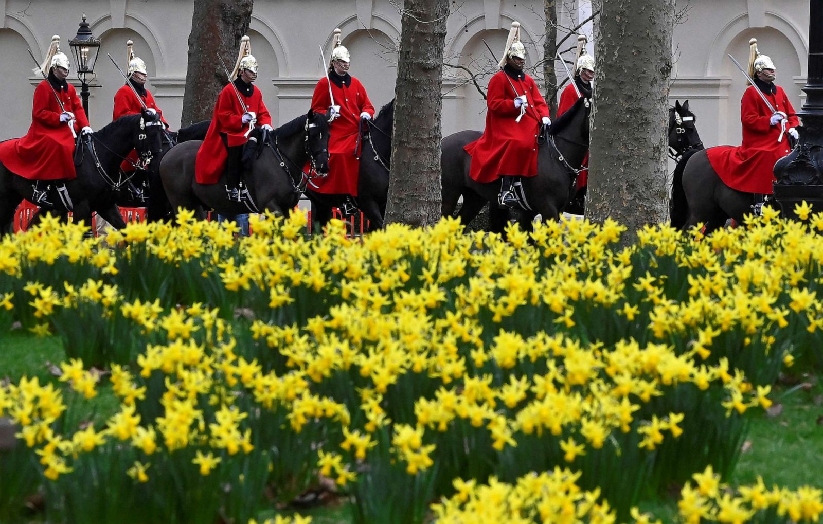 Các thành viên của Đội kỵ binh đi ngang qua những bông hoa thủy tiên vàng mới nở ở London, Anh