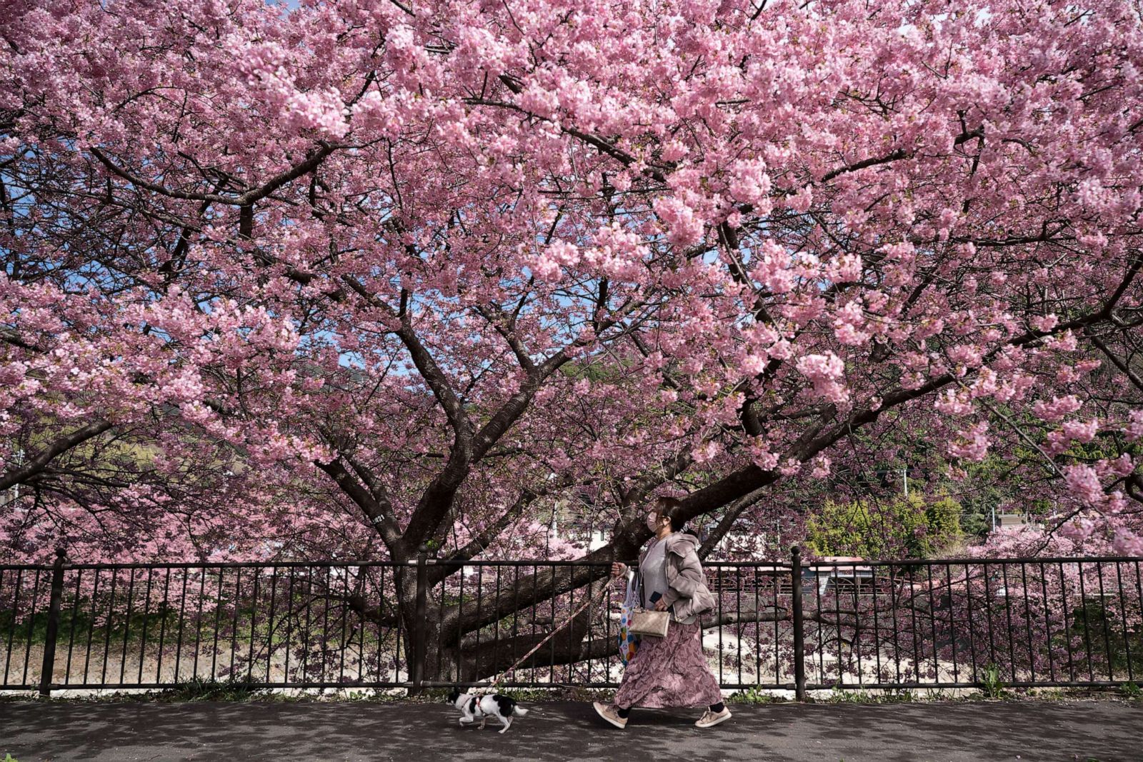Một người phụ nữ dắt cún cưng đi dạo dưới tán cây anh đào đang nở rộ tại Kawazu, Nhật Bản