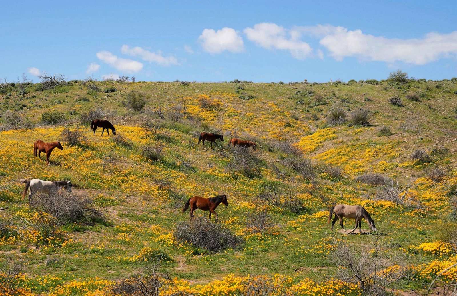 Ngựa hoang gặm cỏ trong sắc Xuân rực rỡ tại Rừng Quốc gia Tonto Arizona, Mỹ
