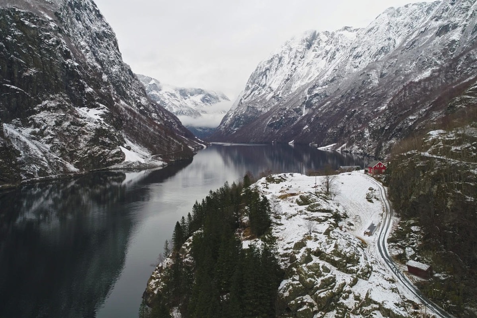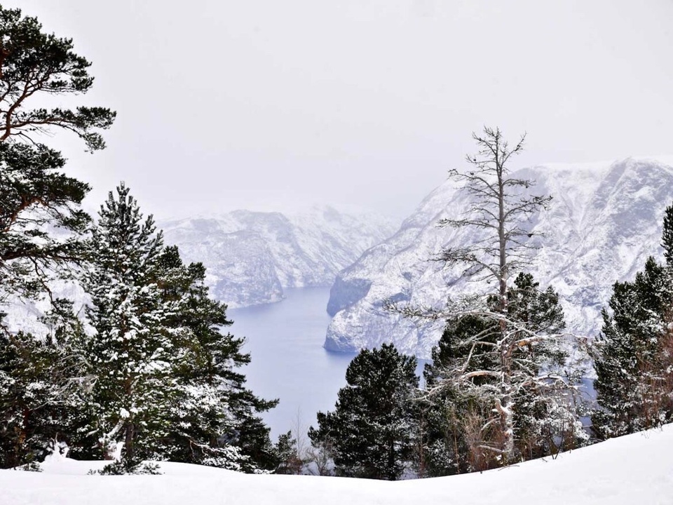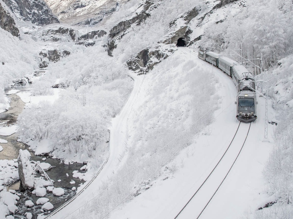 Khung cảnh vịnh hẹp Nærøy. Ảnh: Norwegian Fjords. Xuyên suốt chuyến hành trình kéo dài 2 giờ đồng hồ trên hành trình đường sắt từ Flåm đến ga Myrdal trên cao nguyên Hardangervidda, du khách sẽ được ngắm nhìn khung cảnh kỳ vĩ của những dãy núi bao phủ bởi tuyết trắng. Đây được coi là hành trình đường sắt đẹp nhất thế giới, cũng là cung đường sắt không dây cáp và bánh răng leo núi dài nhất thế giới với tổng chiều dài 20 km, đi qua 20 đường hầm và đi lên độ cao 867 km so với mặt nước biển.