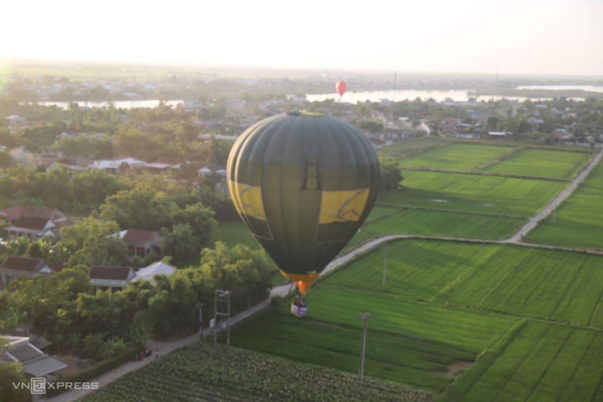 Khinh khí cầu đi qua cánh đồng lúa làng Tiên Nộn, xã Phú Mậu. Khung cảnh nơi đây làm cho nhiều du khách cảm thấy thích thú khi trở về với tuổi thơ.