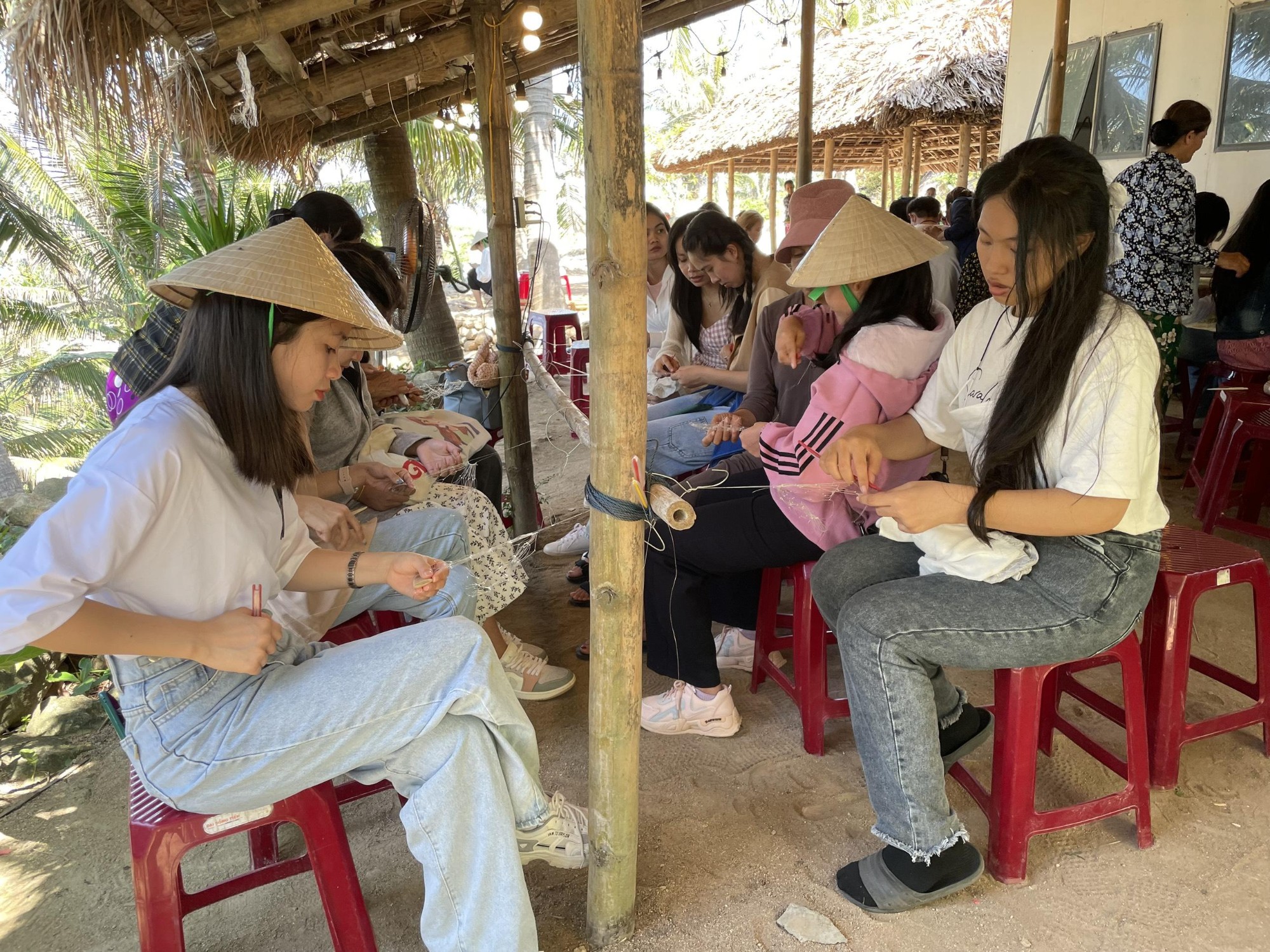 Du khách trải nghiệm đan lưới cùng người dân. Ảnh: NVCC. Trong làng sử dụng vật liệu thân thiện với môi trường, cảnh quan có cây bản địa. Từ đầu đến cuối làng chỉ hoa giấy, vật liệu bỏ đi được tái chế trang trí nhà cửa cho khách ngồi ăn uống, tham quan.