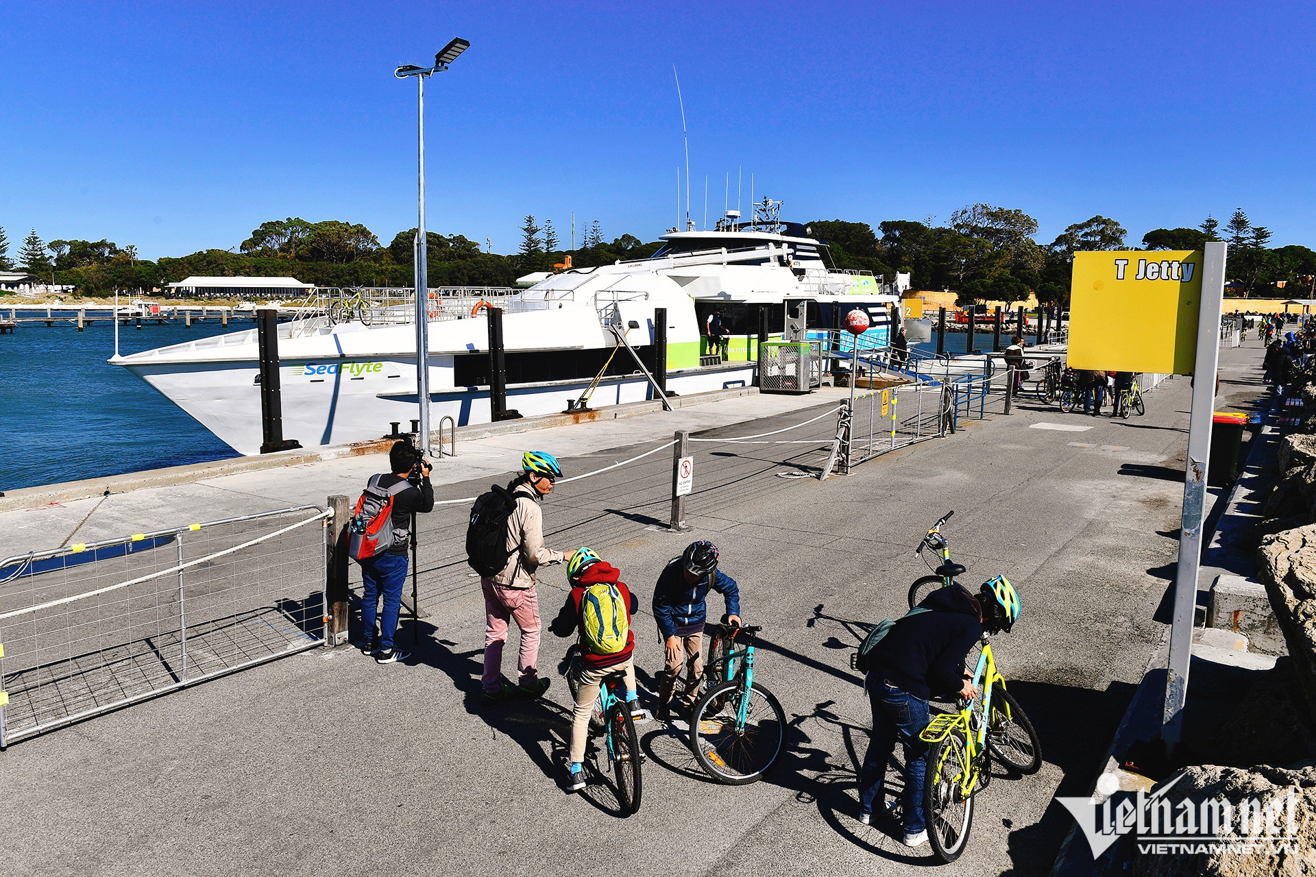 Những người dân Australia mang theo xe đạp vừa đặt chân lên đảo Rottnest. Để có mặt tại đây, du khách có thể bắt phà, tàu thuyền từ bến Fremantle, khu cầu cảng trung tâm Perth hoặc bến thuyền Hillarys.