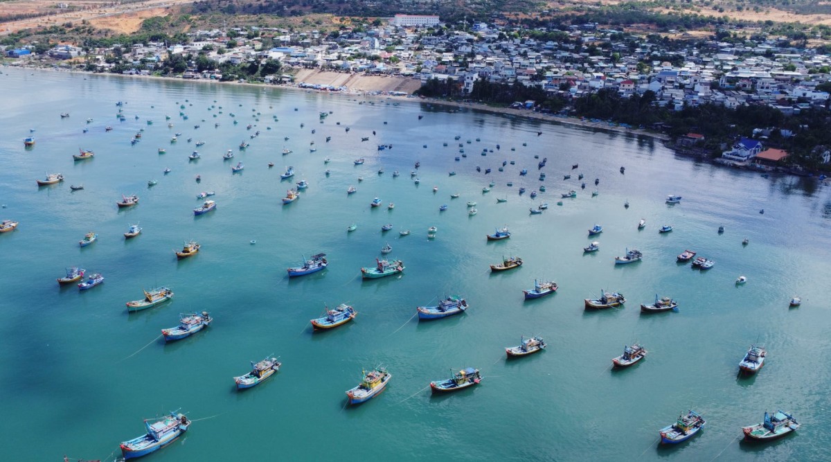 Ghe tàu neo đậu tại làng chài Mũi Né, TP Phan Thiết, tỉnh Bình Thuận tạo nên khung cảnh thanh bình. Hiện thành phố biển Nam Trung Bộ đang vào mùa đẹp nhất, nước biển trong xanh và mát lành từ tháng 4 đến tháng 8.