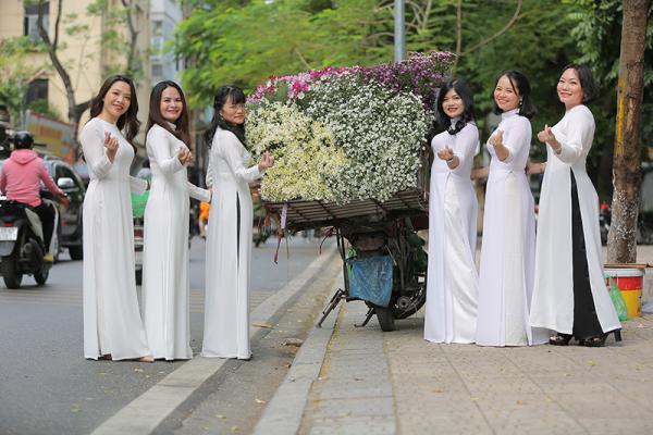 Chúng tôi đã tranh thủ chọn hoa và mượn tạm khung hình với xe hoa đầy ắp, như đang ôm cả mùa thu vào lòng. Rong ruổi khắp các con đường, với bó hoa cúc họa mi, hoa bướm và hoa baby ôm trước ngực, chúng tôi như trở thành những nàng thơ mộng mơ đầy trong trẻo dưới trời thu.