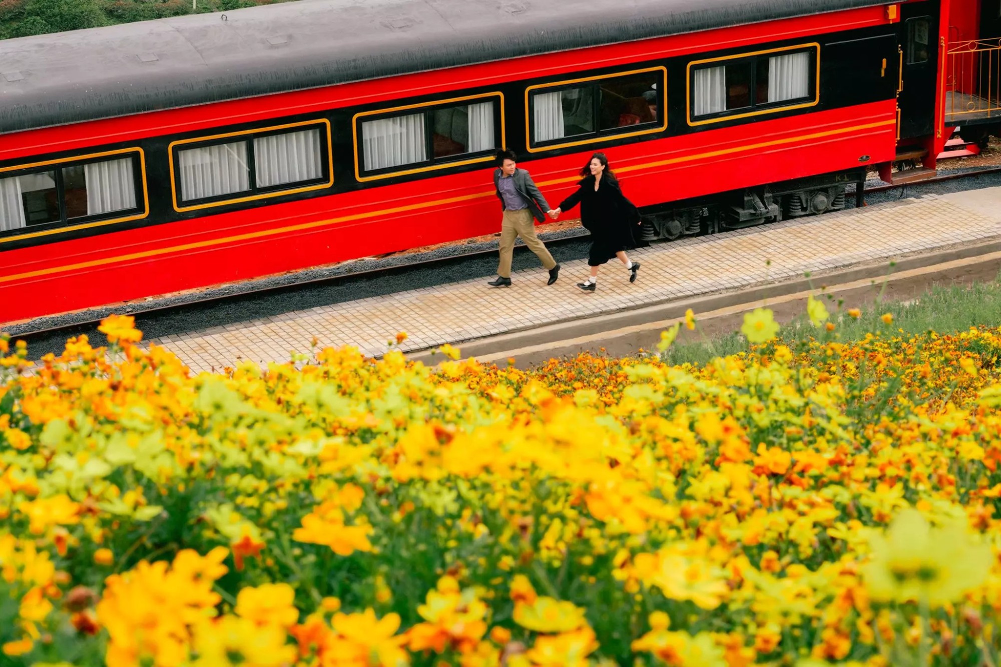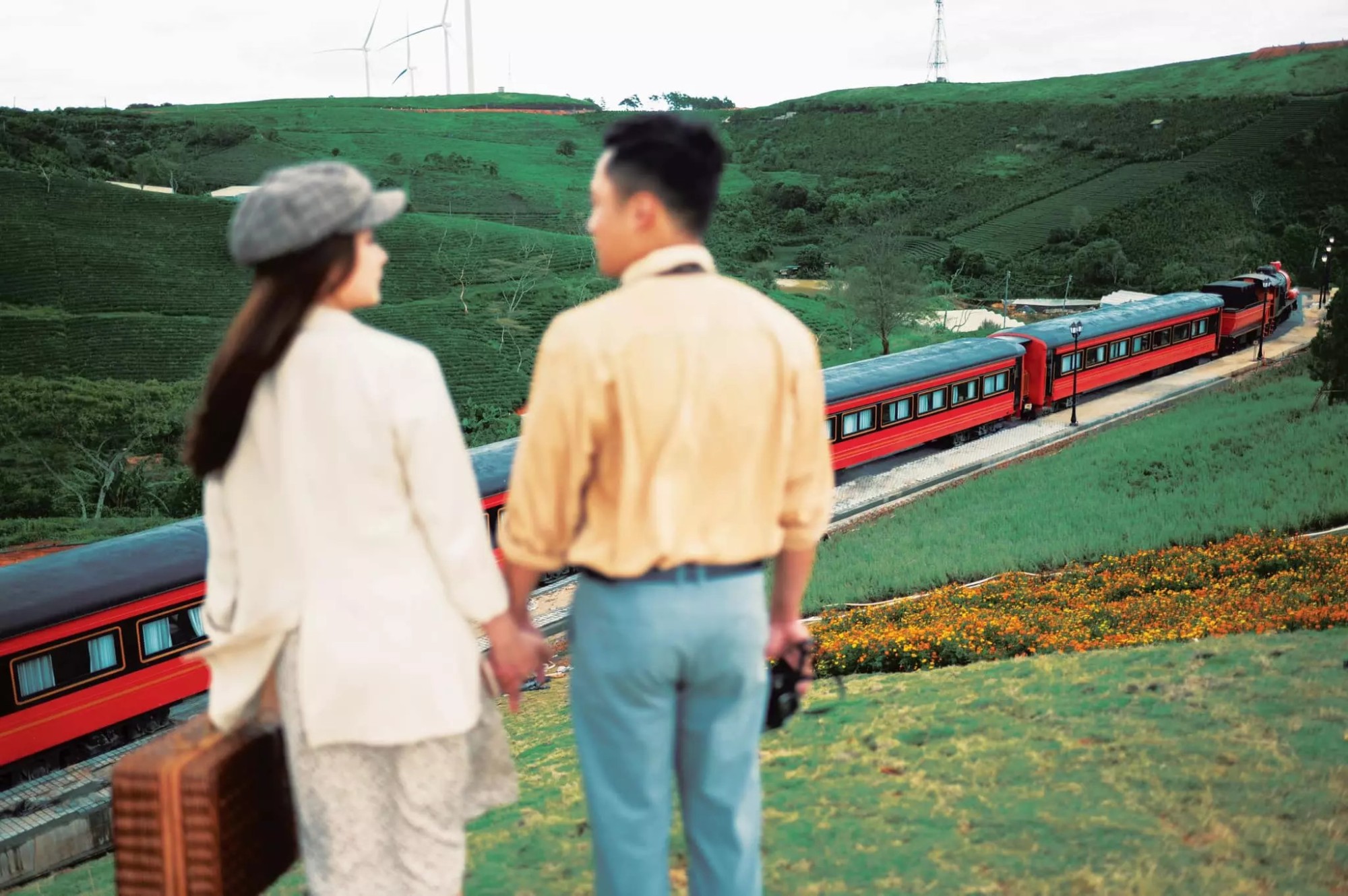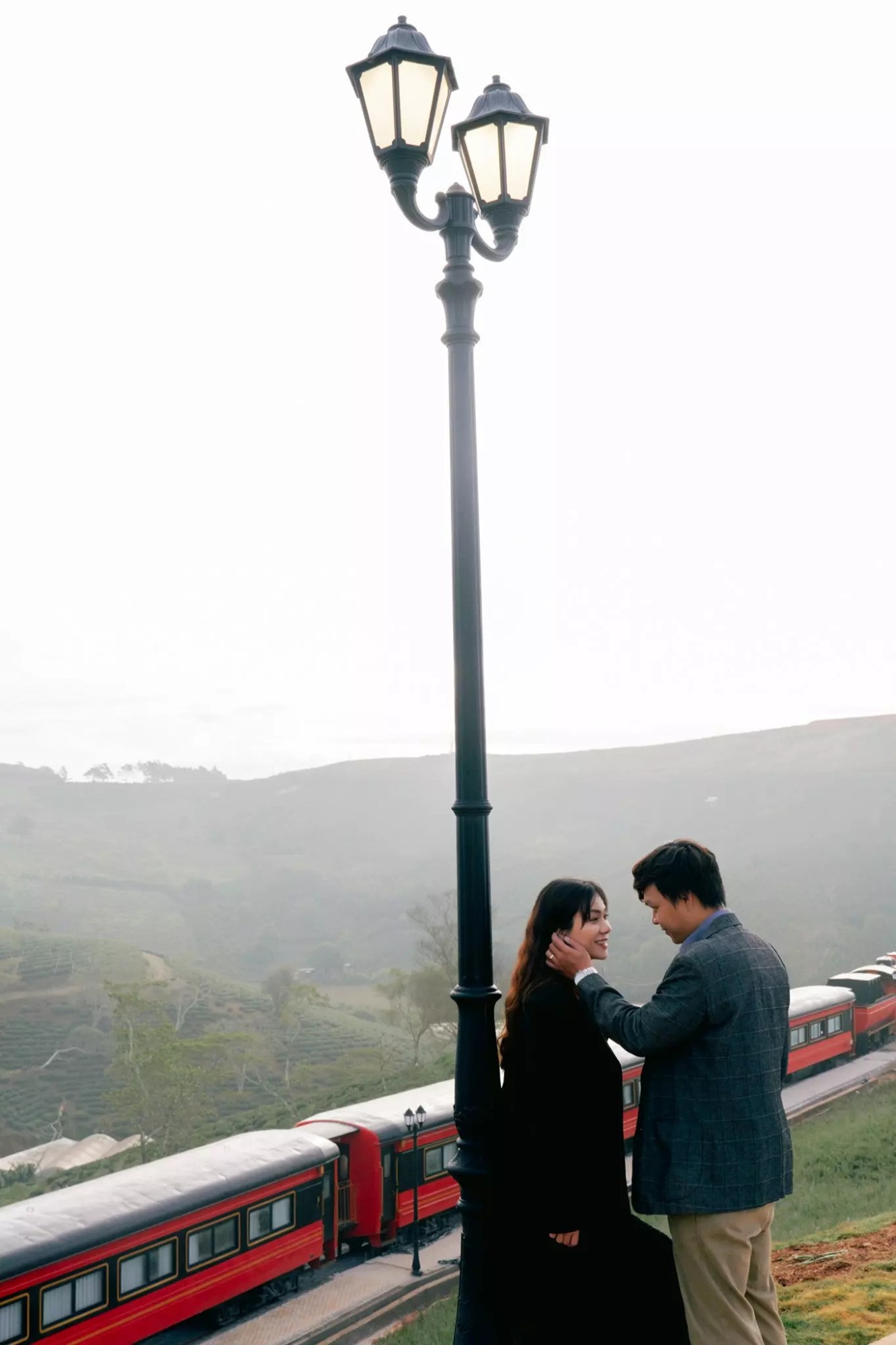 Ảnh: Viên Diệu PhátCặp đôi Nguyên - Hân di chuyển từ TPHCM lên Đà Lạt du lịch và chụp ảnh kỉ niệm. Hình ảnh đoàn tàu đỏ nằm giữa đồi hoa khiến họ mê mẩn. "Đây là đoàn tàu thật được cải tạo, trùng tu nên nhìn vô cùng tự nhiên. Khi chụp hình cho khách tại đây, mình cảm giác như đang ở một nhà ga đầy mộng mơ", nhiếp ảnh gia Viên Diệu Phát (TPHCM) chia sẻ.
