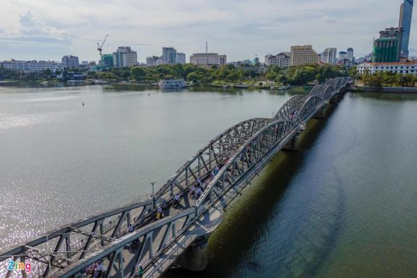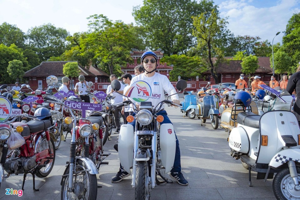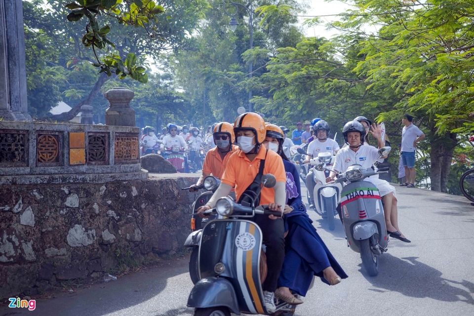 Trên những chiếc xe máy có tuổi đời hàng chục năm, đoàn diễu hành di chuyển từ từ qua cầu Trường Tiền - địa danh nổi tiếng gắn liền với con sông Hương thơ mộng.