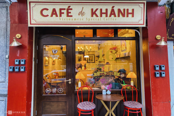 "Chuông khánh bây giờ ngân nga/ Ai ơi nhớ ghé khi qua Bờ Hồ" là câu chào khách của Café de Khánh, nằm ở 16 phố Báo Khánh, gần Nhà thờ Lớn. Quán theo phong cách cổ điển Pháp, thể hiện rõ qua biển hiệu, cửa ra vào, gạch lát tường, bàn ghế.
