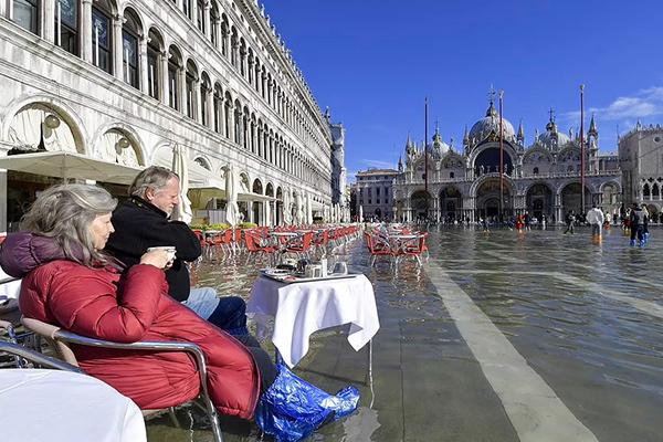Bất chấp lụt lội, hai vợ chồng du khách này vẫn ung dung thưởng thức cà phê ngoài trờiVenice là một trong những nơi bị ảnh hưởng nặng nề nhất bởi biến đổi khí hậu do địa hình độc đáo cùng với 117 kênh đào chảy khắp thành phố này.