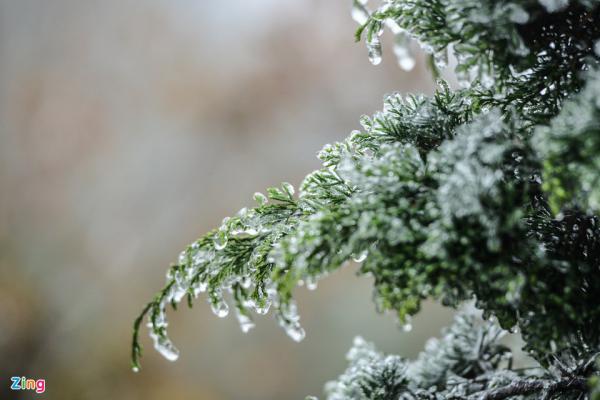Nhiệt độ xuống dưới 0 độ C khiến giọt mưa bám trên các cành cây, đồ vật đọng thành băng.