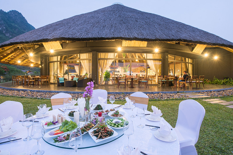 Đặc biệt nhà hàng Nón trong khu nghỉ là nơi “tinh hoa” ẩm thực của Hòa Bình được gửi gắm. Không cầu kỳ, xa hoa, song mỗi món ăn như cỗ lá lợn mán, thịt trâu nấu lá lồm, cá suối chiên, canh gà đồi nấu măng, cơm lam… đều chinh phục trái tim thực khách nhờ nguyên liệu tươi ngon nhất và hương vị Tây Bắc thấm đượm.