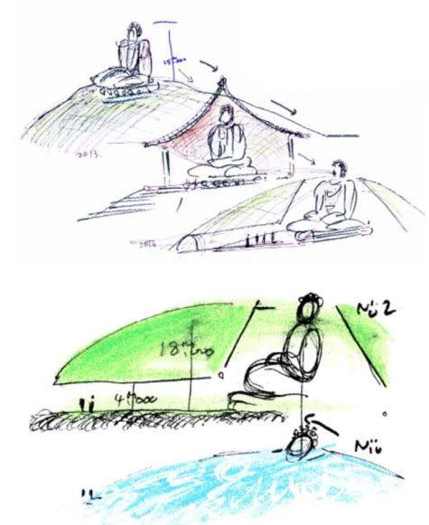 “Từ 15 năm trước, mục đích ban đầu của dự án là xây một nguyện đường (phòng cầu nguyện to) để tôn bật lên vẻ đẹp của bức tượng Phật. Địa điểm được chọn là một ngọn đồi có dốc thoai thoải trải đều 180o nằm trong địa phận của nghĩa trang”, Ando chia sẻ. “Nhưng cho đến gần đây, chúng tôi nhận ra để ngài tọa lạc một mình một cách trơ trọi như vậy sẽ tạo ra một ấn tượng “không yên bình”. Chủ đầu tư công trình muốn đem đến thêm cảm giác bình lặng hơn cho du khách đến nơi đây. Ý tưởng lúc đó của tôi là thay vì để ngài trơ trọi trong một nguyện đường thì tôi quyết định đặt ngài vào trong một ngọn đồi và phủ toàn bộ vùng đồi với hoa oải hương. Sau khi phủ xong, khung cảnh trở nên dễ chịu hơn, đầu vị Phật này lấp ló một cách thú vị dưới những khóm hoa, và chúng tôi gọi ý tưởng này là “Vị Phật ló đầu””. Với việc bổ sung vào công trình này thảm thực vật theo mùa đã tạo nên một bức tranh phong cảnh nền đa dạng tuyệt vời, chúng sẽ thay đổi từ xanh (Xuân) sang tím (Hạ) và trắng (Đông).