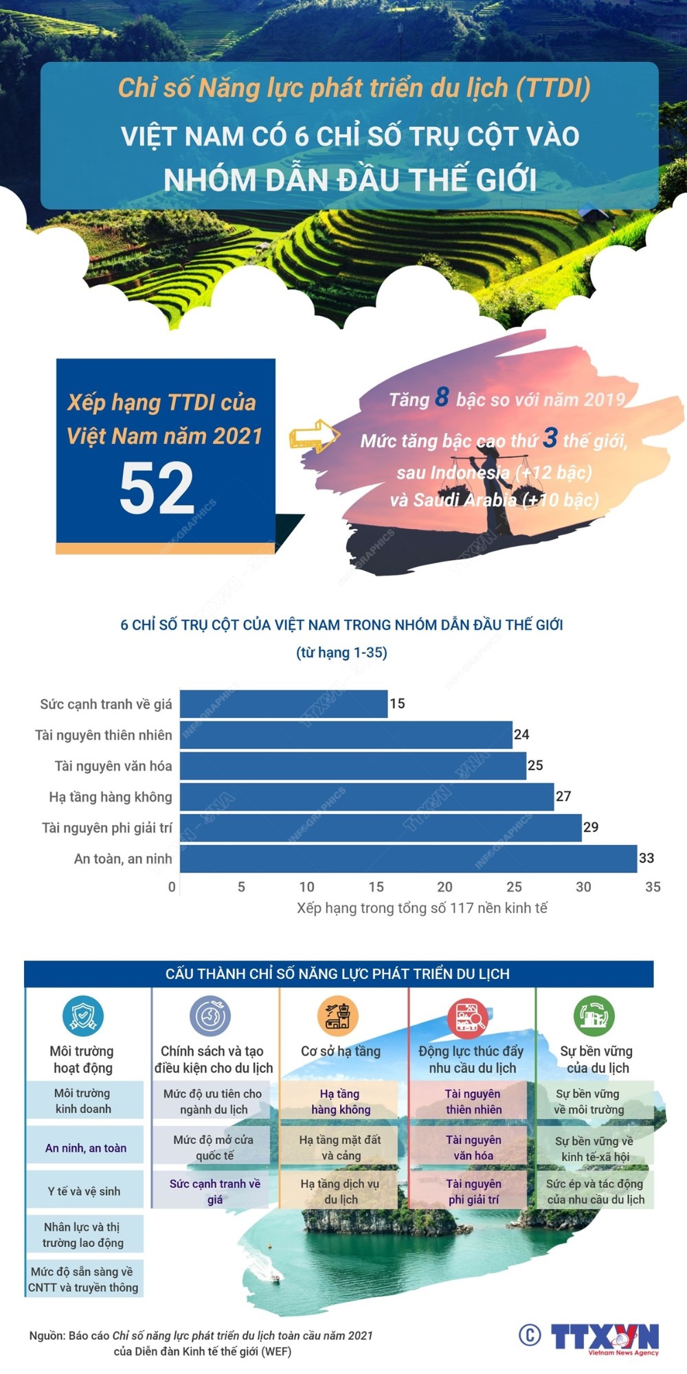 Theo Báo cáo Chỉ số năng lực phát triển du lịch toàn cầu năm 2021 của Diễn đàn Kinh tế thế giới (WEF), du lịch Việt Nam xếp ở vị trí 52/117 nền kinh tế toàn thế giới, tăng 8 bậc so với năm 2019. Đây là mức tăng cao thứ 3 thế giới, sau Indonesia (tăng 12 bậc) và Saudi Arabia (tăng 10 bậc). Trong 17 chỉ số trụ cột, du lịch Việt Nam có 6 chỉ số được xếp vào nhóm dẫn đầu thế giới, gồm: Sức cạnh tranh về giá, Tài nguyên thiên nhiên, Tài nguyên văn hóa, Hạ tầng hàng không, Tài nguyên phi giải trí và An toàn, an ninh.