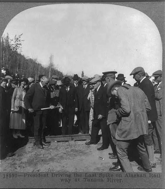 Ảnh: Library of CongressTrước khi Alaska là một tiểu bang, đường sắt đã được hoàn thành vào 7/1923 dưới thời tổng thống Warren G. Harding. Tại thời điểm đó, đường sắt được xem như một "cú nhọn vàng" trên mặt đất tại thành phố Nenana.