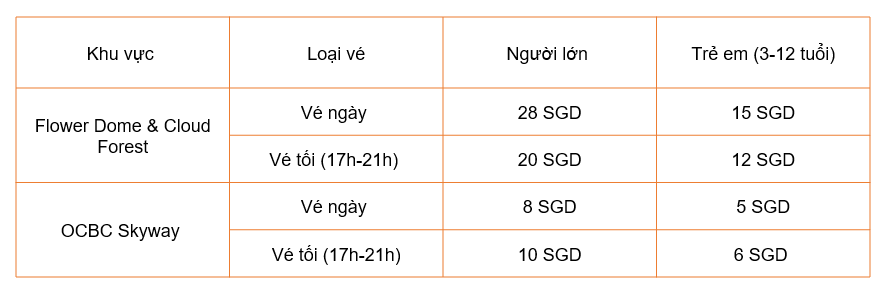 Hầu hết những khu vực như Supertree Grove, Dragonfly & Kingfisher Lakes, World of Plants… ở Gardens by the Bay đều miễn phí vé. Tuy nhiên, đối với 2 khu nhà kính (Flower Dome, Cloud Forest)và OCBC Skyway thì bạn cần phải mua vé vào cửa.