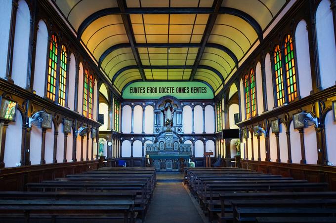Bên trong thánh đường có nhiều hàng cột nhỏ được liên kết với nhau bằng các vòng cung gỗ.