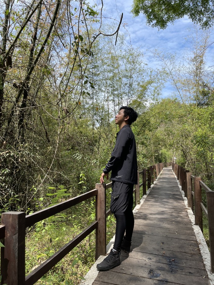Minh bên con đường rừng trong vườn quốc gia. Ảnh: NVCCĐi đường rừng nhưng du khách không sợ lạc vì có chỉ dẫn rất cụ thể, ngoài ra còn có biển chú thích từng loại cây. Minh cho hay: "Cung đường xuyên rừng, xuất hiện nhiều cây có hình thù ấn tượng. Nhiều cây được chú thích kỹ về giống loài, như cây tùng 400 tuổi, được mệnh danh là "thần rắn" của rừng Nam Cát Tiên, thu hút nhiều du khách chụp hình.
