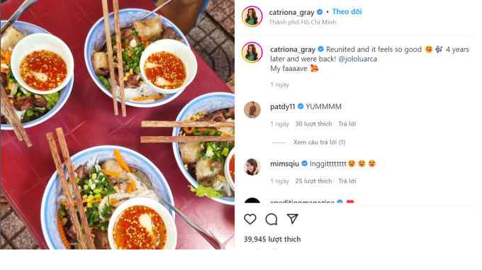 Miss Universe 2018 Catriona Gray đến Việt Nam vào ngày 23/6 để làm giám khảo cuộc thi Miss Universe Vietnam. Sau chương trình, cô ở lại TP HCM đi dạo, uống cà phê, ăn bún thịt nướng, đi xe buýt hai tầng tham quan thành phố... Bún thịt nướng là món ăn yêu thích của hoa hậu, trước đó vào năm 2018, cô đến TP HCM và ăn món này, sau đó ghi trên trang cá nhân "đã tìm được tô bún ngon nhất". Lần trở lại này, người đẹp Philippines vui mừng khi lại được ăn. Ảnh chụp màn hình