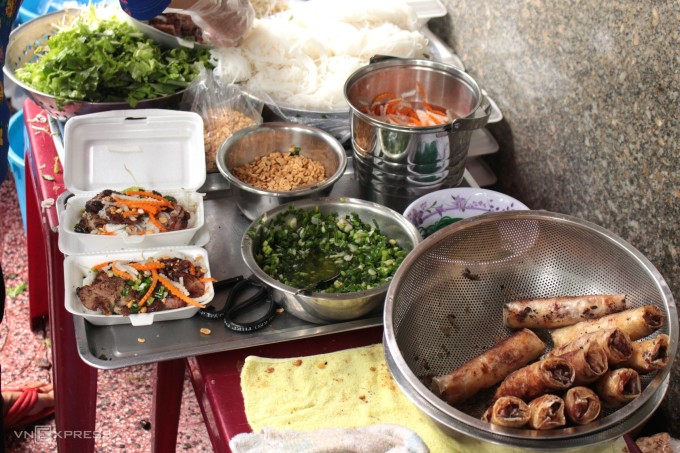 Nguyên liệu được làm sẵn bày trên bàn nhỏ để nhân viên tiện làm món cho khách. Theo cô Vân, chả giò, thịt nướng và nước mắm được làm theo công thức riêng mang khẩu vị miền Tây. Mỗi ngày, chủ và nhân viên dậy từ 5h để chuẩn bị nguyên liệu, ướp thịt, làm chả giò... đến 6h30 có món bán cho khách. "Tôi chọn nguyên liệu rất kỹ, mỗi ngày đều làm đồ tươi, không trữ lạnh", cô Vân nói.